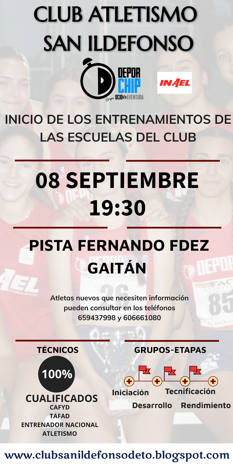 El próximo lunes día 8 de septiembre iniciamos los entrenamientos de las Escuelas del C. Atl. San Ildefonso. Será en la Pista "Fernando Fernández Gaitán" de Toledo a partir de las 19:30 h.